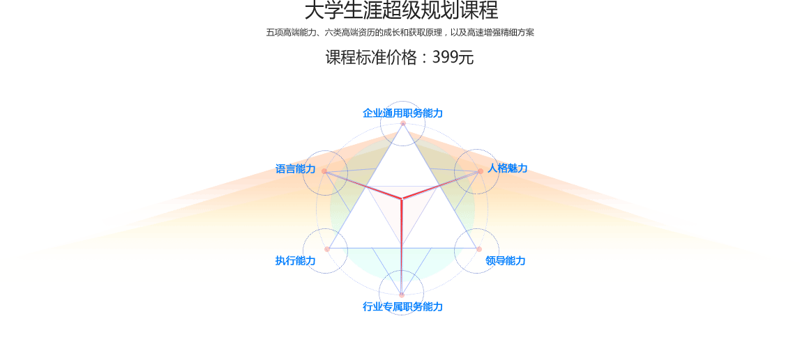 每个人从小到大的一切学习和训练都是为了培育出创造物质与精神财富的能力。每个人告别消耗财富的学生时代踏入社会的使命就是为企业等社会机构创造财富。企业就是追求和创造财富的组织,所以企业将根据一个大学生创造财富能力的大小,来决定是否录用,通过他创造财富的数量和质量,来给他财富回报。一个大学生必然经历的求职竞争就是企业选拔具备更强创造财富能力的人才的考试。为企业创造财富的最直接和最有效的能力就是高端能力。大学生职业发展的关键就是在基本能力之上发育出最直接和最有效创造财富的高端能力。高端能力共有五种,对应六项高端能力指标,其中高价值历史活动指标是指五种高端能力所创造的历史成就,也就是用来证明自身优秀程度的高端资历。